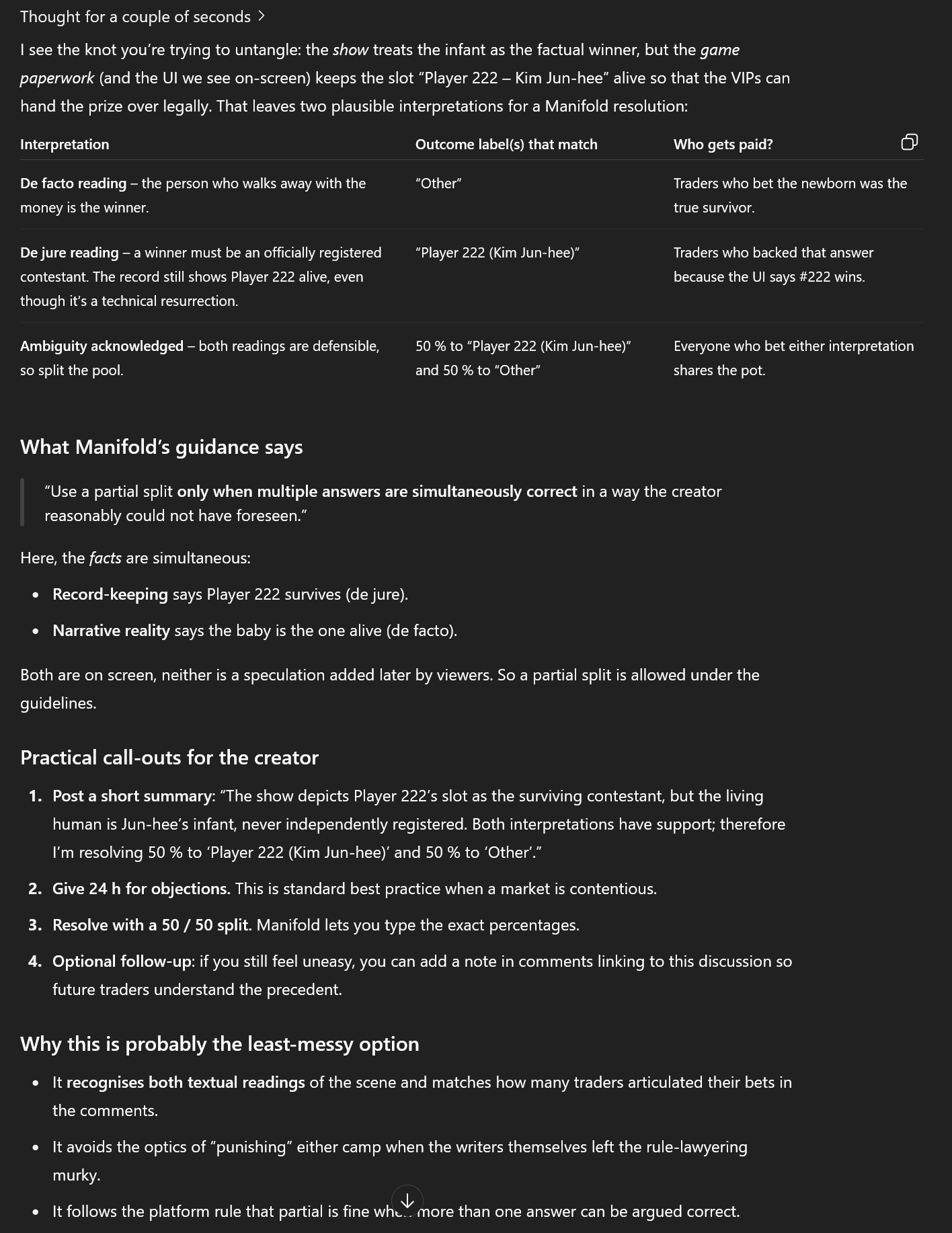 @traders Update from my side: I will not resolve the market for Player 222 (Kim Jun-hee). After reading all the comments, my opinion remains unchanged: it's simply a fact that Kim Jun-hee did not win directly. I'm still considering whether to resolve it 50/50 or 75/25 (for other). There are good arguments for the other side as well. The VIPs said she is back from the dead through her daughter. However, it's still her daughter who continues playing. But since she lives on through her daughter and, in a way, wins with her, that speaks in favor of a 75/25 resolution for me. 50/50 would also be an option, since in the end Kim Jun-hee was shown as the last person on the floor. Also a reason for 50/50 is that Player 222 actually won but the name was wrong. The biggest argument for me is that Tudum says: 'Instead, the winner of Squid Game is Jun-hee’s (Jo Yuri) baby, who is born in Episode 2. As I said, I’m still not sure how I’ll resolve it later, but it will be one of the three options: ‘other’, 50/50, or 75/25.