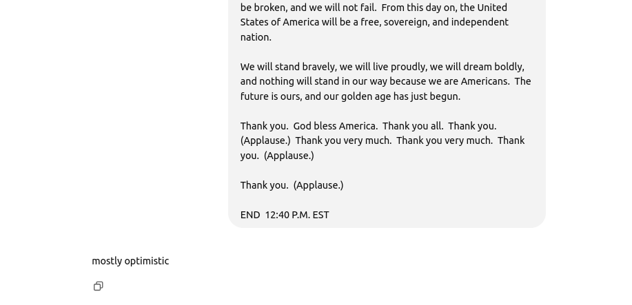I will ask ChatGPT whether it considers the inaugural address to be mostly optimistic or mostly pessimistic and will include the transcript in the prompt.