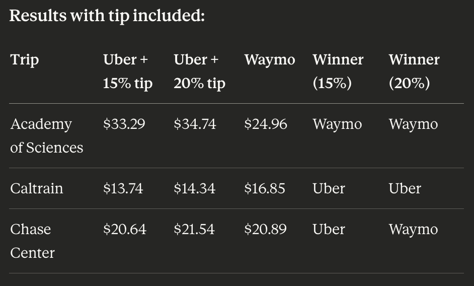 * Waymo: Use the standard "Waymo One" price (no tip is required/expected for robots).