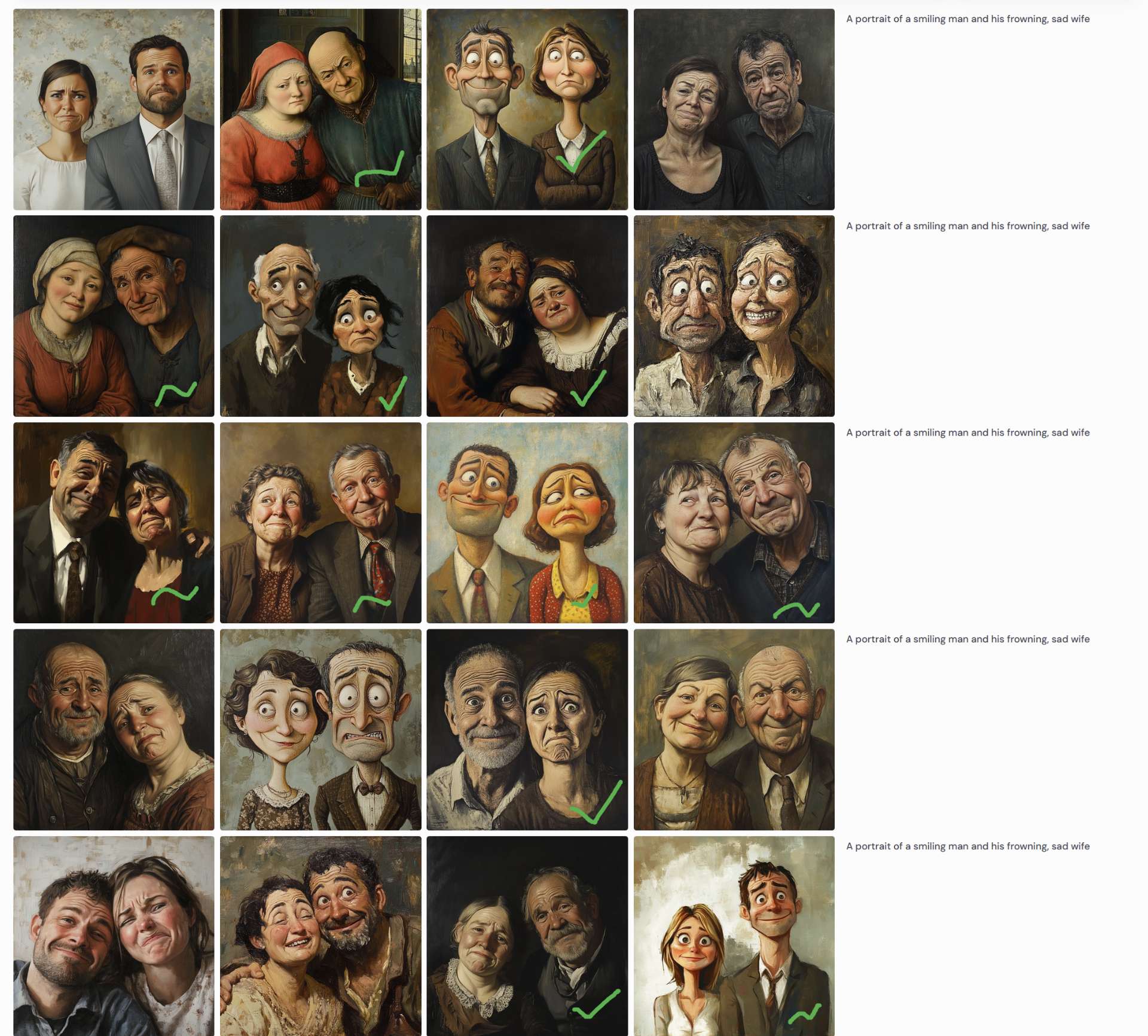 On Dec 31 2024 I will run this prompt in Midjourney five times with random seeds: "a portrait of a smiling man and his frowning, sad wife"