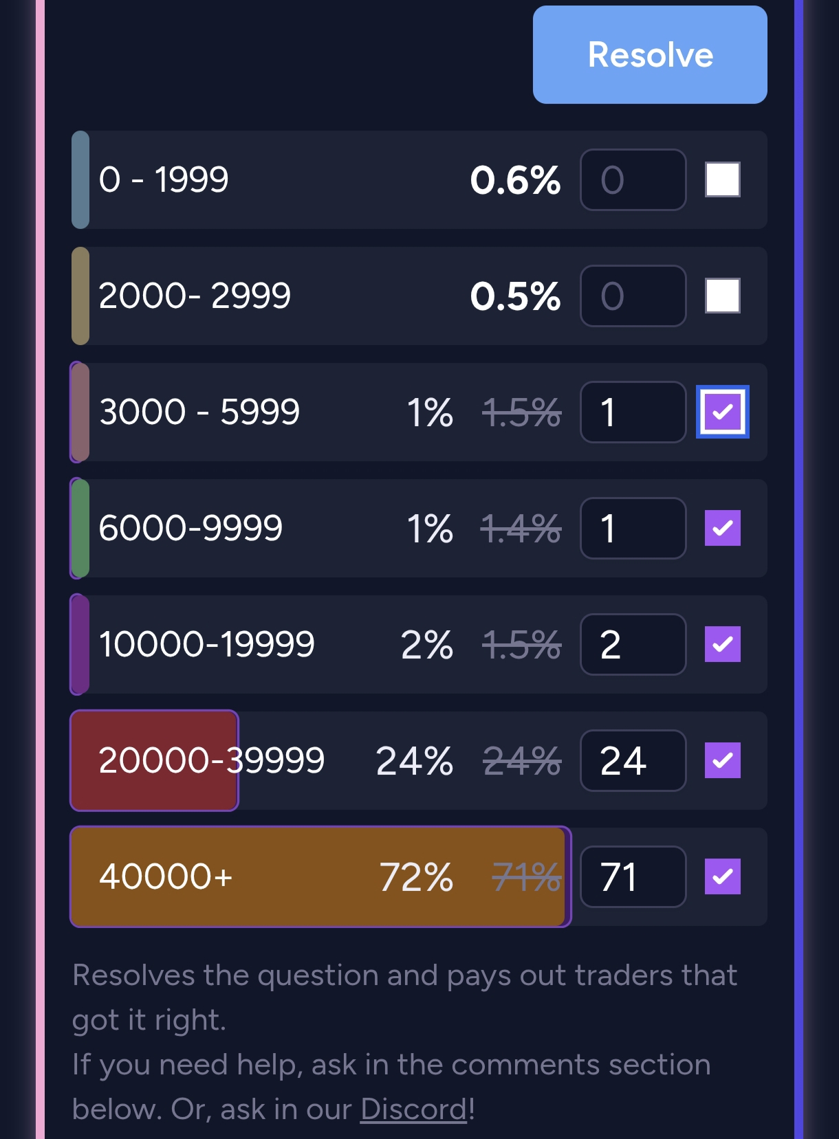 Hmm apparently I can't just resolve the two first ranges as NO. And idk, im afraid selecting the others will lock the market and give people these percentages. Would appreciate if u, a moderator, or any trader could clarify