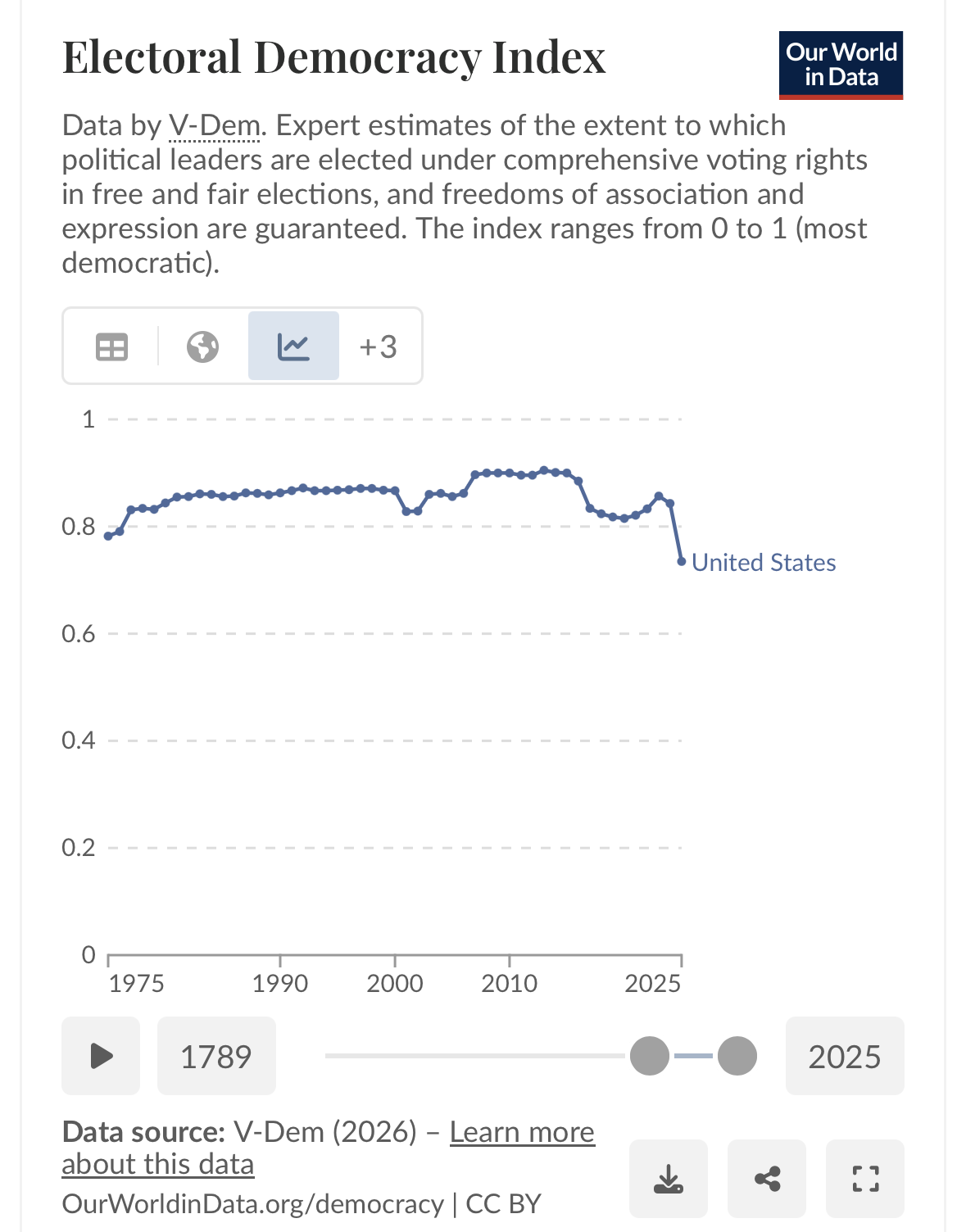2/20/25: One concern that has come up is that our democracy slowly crumbles via a “death by a thousand cuts” but there is not a single major “constitutional crisis” incident that occurs to meet the above criteria. To address this, we can look to international rankings of democratic health to see if we have gone a fundamental change to our democracy as we know it. Four major ones are Varieties of Democracy (V-Dem) Project, the Economist Intelligence Unit (EIU) Democracy Index, Freedom House’s Freedom in the World Report and Global State of Democracy Indices (GSoD). These score and rank democracies generally, so can give us a full picture of the state of our democracy from international, independent sources (except for the Freedom in the World Report, which is US based and received federal funding, and thus may face political pressures re changes to the US score). If we see dramatic, material changes in 2 of those 4 ratings in next four years, I would consider this a resolve to “yes”. It must be both material (defined below) so that no real debate that we are no longer in “democracy as we know it” and in multiple ratings to not allow a single analysis affect the outcome. For V-Dem, the U.S. has scored above a .79 for 50 years (between .79 and .91). If it were to fall below .55, I would consider this a material change from our historical democracy rating as it would be dramatic reduction and put is in line with countries like: Georgia, Honduras, Kenya, Indonesia, Sri Lanka, Liberia. For EIU, we have been in a narrow range of 7.8-8.2 in the nearly 20 years of ratings, within their “full” and “flawed” democracies categorization. I would consider a material change if we fully fell out of the democracies categories and into the middle of the “hybrid regimes” categorization with a 5.0 or less putting us in line with countries like: Bosnia, Morocco, Ukraine, Tanzania, Kenya and Honduras. For House Freedom, we have always been categorized as level 2 “free” since 1972. I would consider a material drop if we dropped to a level 1 (“partly free”), now in line with countries like: Bolivia, Armenia, Ecuador, Sierra Leone, North Macedonia and Hungary. Lastly, for GsoD, we have remained very consistent with our scores in the four categorization since the 1970s. We currently rank at the following spots out of 173 countries: Representation (46th), Rights (34th), Rule of Law (26th), Participation (8th). If we drop 40+ country spots in two of those four categories (50+ in participation since starting so high), I would consider that a material change and would put us in line with counties like: Benin, Honduras, Ukraine, Suriname, Hungary, Malawi, Mongolia.