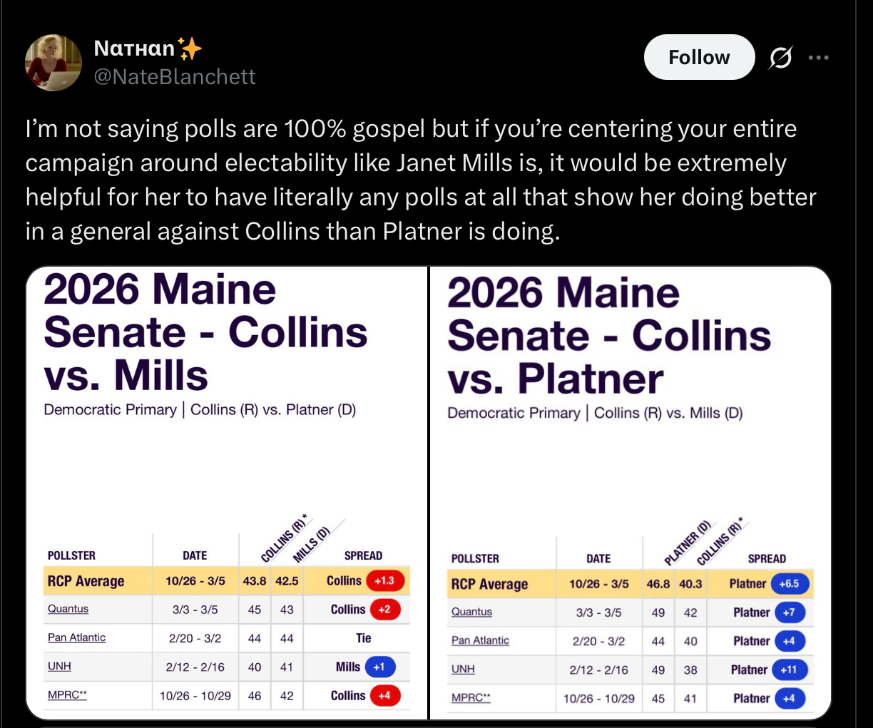 @Jack1 platner has financial support of Dems in maine and gets good crowds. Hard to seem him losing