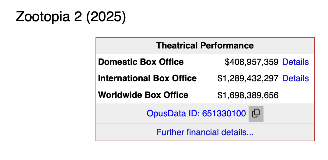 @polymathematic for what it's worth, Claude thinks Box Office Mojo's numbers are more reliable here based on other industry reporting and a recent Disney earnings call. https://claude.ai/share/e05e70bc-6f88-4857-8f57-17bd1b301c69