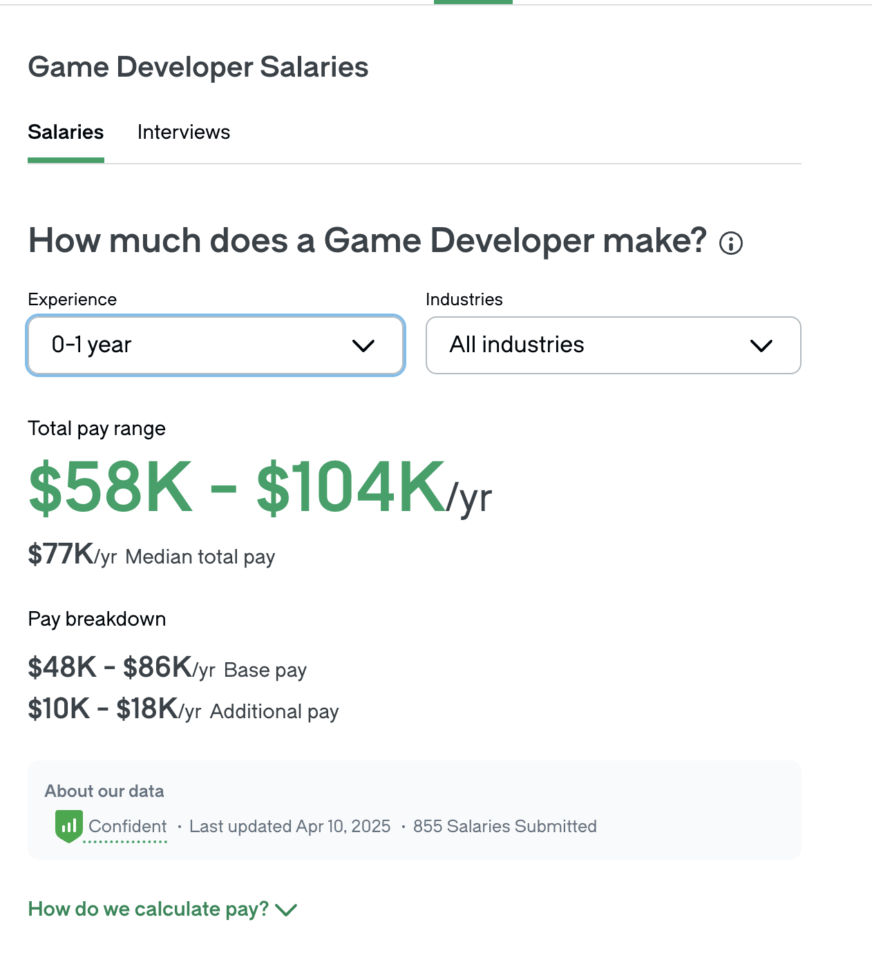 On Jan 1, 2026, I'll resolve this market according to the "Total Pay" field on the Glassdoor page for Game Developer in the United States, with 0-1 years of experience, across all industries.