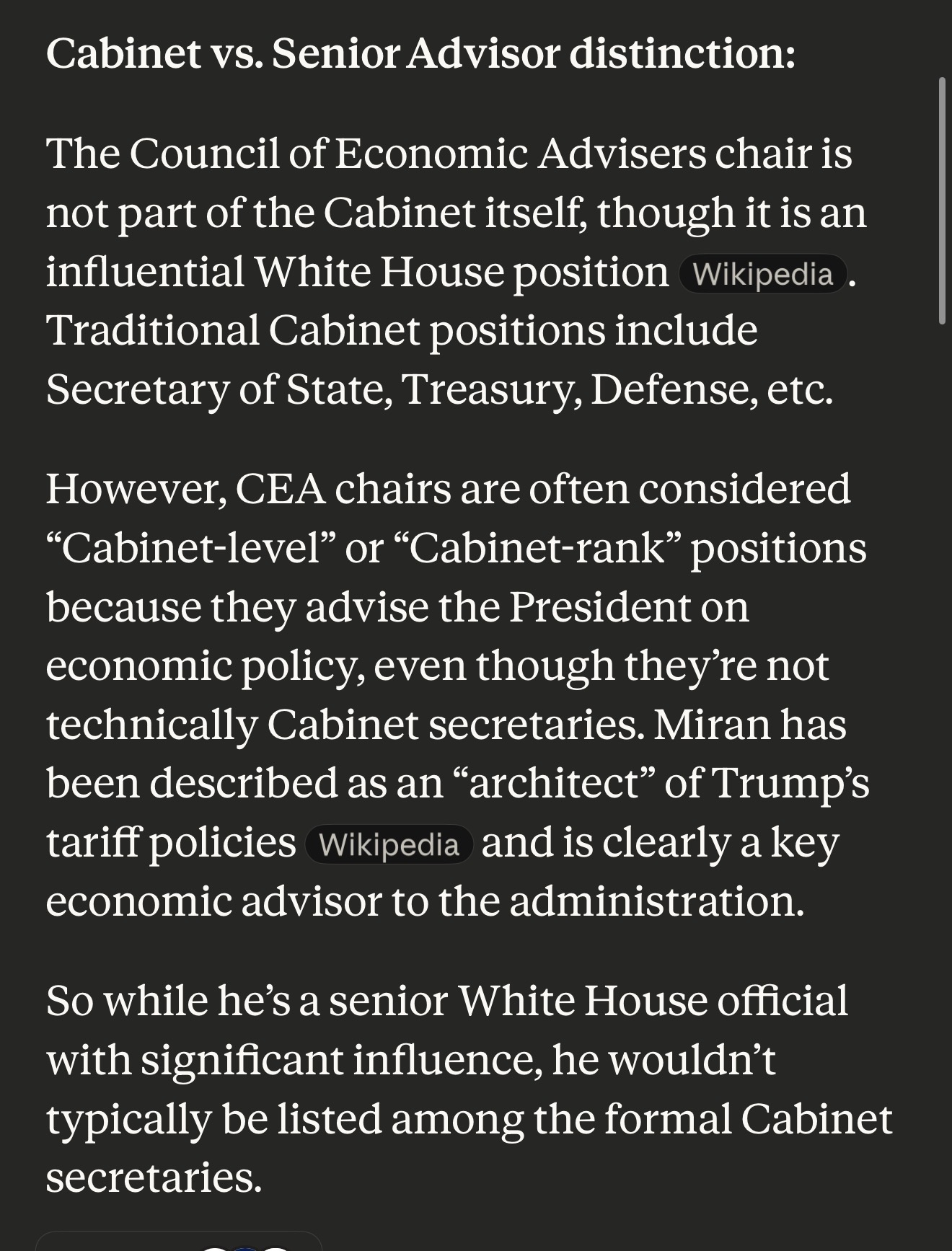 @Jack1 I just asked a simple question: Is Stephen Miran considered as trump’s cabinet member. And CEA chairs are often considered cabinet-level. Also if we are going by official White House then Suzie wiles is also not listed.