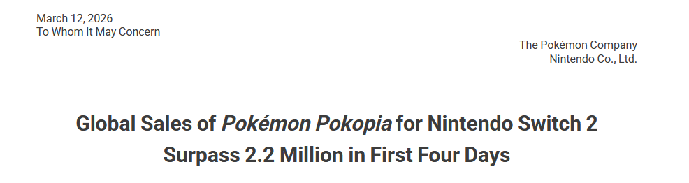 The data should be released by Nintendo in early May 2026. If Pokopia does not make the "million-seller" list, it will be assumed to have sold under 1 million copies.