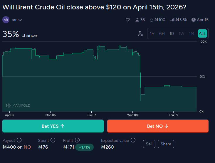 This market resolves YES if Brent Crude Oil closes at or above $120 per barrel on April 15, 2026. Resolution will be determined using the official closing price from the U.S. Energy Information Administration (EIA) at https://www.eia.gov/todayinenergy/prices.php or equivalent authoritative source (e.g CNBC, Bloomberg). If the market does not trade on April 15, 2026, the most recent trading day's close will be used.
