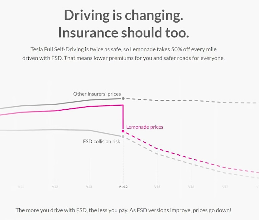 Insurance company lemonade now reports and is will to insure Tesla cars with FSD at half the price per mile of Tesla cars without FSD in operation. Note the Lemonade graphic, they are projecting Tesla FSD to be ten times safer version 17. FSD 15 will have half of the risk of collisions. I believe this is an actuarial projection from data they are getting. Tesla already has 500+ cars as robotaxi. They said no chase cars and no safety monitors for some of the Austin cars.