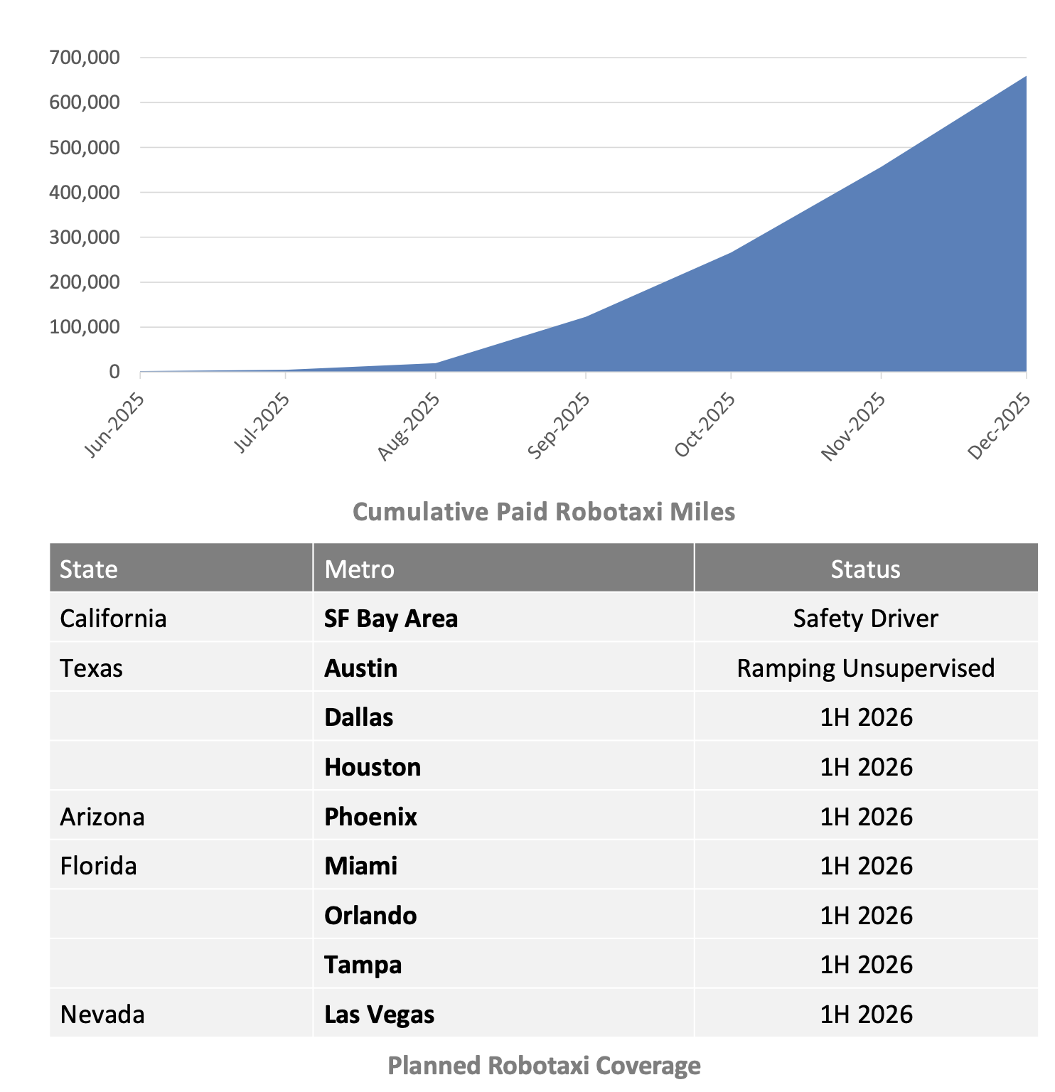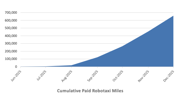 @dreev Tesla is now reporting the paid robotaxi miles in the quarterly. It was about 200,000 miles in December. Tesla now has 500+ cars in Austin and SF Bay Area and is doubling each month (verbally reported on earnings call). A fleet of 2,000 cars in March 2026 (as per the doubling progression: 500 in Jan → 1,000 in Feb → 2,000 in Mar):