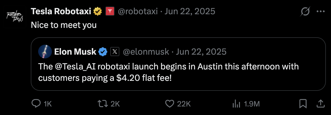 @ChristopherRandles The Robotaxi service was launched in June with no person in the driver's seat from day 1 and a gradual set of security measures, as the quality of the service was validated. You might have been more convinced with a big launch of 100 cars, but a launch of 10 cars is still a launch. E.g., a start.