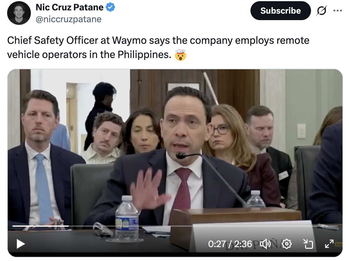 @dreev Fun fact that came out about Waymo: their remote assistance is in the Philippines https://x.com/niccruzpatane/status/2019213765506670738