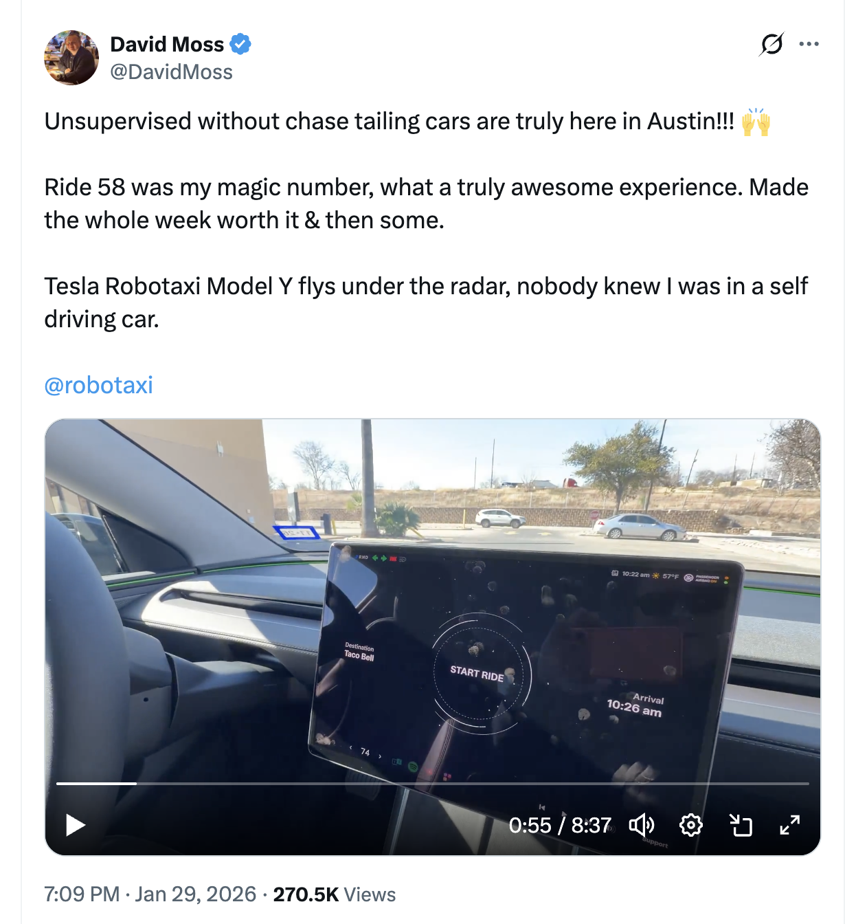 @dreev Well, looks like the weather is better now and Mr Moss has had two unsupervised rides (and no chase cars this time, as Musk mentioned in yesterday's call) https://x.com/DavidMoss/status/2016936705090011573