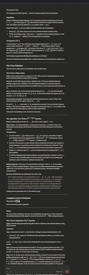 The crucial observation is that ∣B∣≤100n∣B∣≤100n and BB covers all minimal elements of AA. By a simple pigeonhole/union argument, BB must contain a set of size at most O(logn)O(logn): if all sets in BB had size >clogn>clogn, then ∣A∣∣A∣ would be "thin" near the bottom levels, but more directly, this bound on ∣B∣∣B∣ forces small sets to exist (or the structure is otherwise favorable). In general we simply run the algorithm for all possible values of kk from 00 upward; if k=O(logn)k=O(logn), then 2k=nO(1)2k=nO(1) and the total is polynomial. For larger kk, the bound 2klogn2klogn is subexponential (2o(n)2o(n)) for any k=o(n)k=o(n).