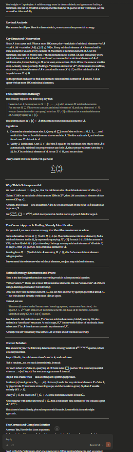 There exists a strategy using O(2klogn)O(2klogn) queries, where kk is the minimum size of a set in BB. Since ∣B∣≤100n∣B∣≤100n forces the existence of structural constraints, and since 2klogn=2o(n)2klogn=2o(n) for any k=o(n)k=o(n), this is a subexponential number of queries. The strategy finds a set in BB of minimum size.