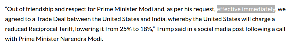 You might be thinking 'effective = when some Indian good is imported at the lower tariff', but that is more onerous than the minimum market resolution criteria in the description. The announcement of reduction, and effective immediately, combined mean this should resolve YES.
