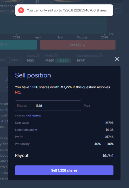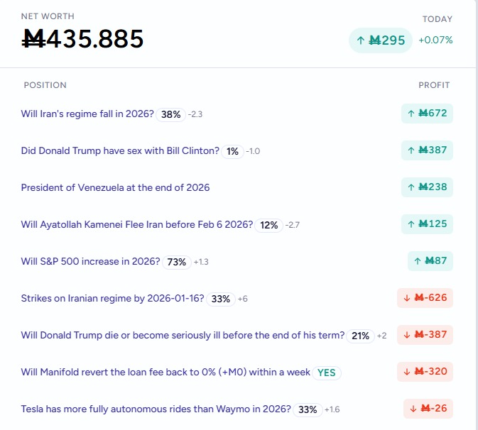 For as long as I have been tracking (probably since mid 2025), I had loan to net ratio of roughly 125%, taking loans daily and almost always spending my balance down to 0 by the end of each day. Paid a bit down and got a bit of liquidity when a bunch of "will X happen in 2025" resolved. After the free daily loans became, I raised my "min edge to invest" by a factor of >2x (from 1.8% to 4%) to focus more on opportunities to liquidate my existing positions, reducing the loan balance further. Still my total loans right now are about 126K (down from 150K max at the end of December) on a 121K net worth, with liquidity down to M200. And I am staring at 5%+ returns on 3-year market, and no way to invest... (Of course, with 0.03% daily, 5% return over 3 years would still not be enough - but this is a sufficiently vilotile market that I could hope to not have to wait 3 years to be able to liquidate; still painful though)...
