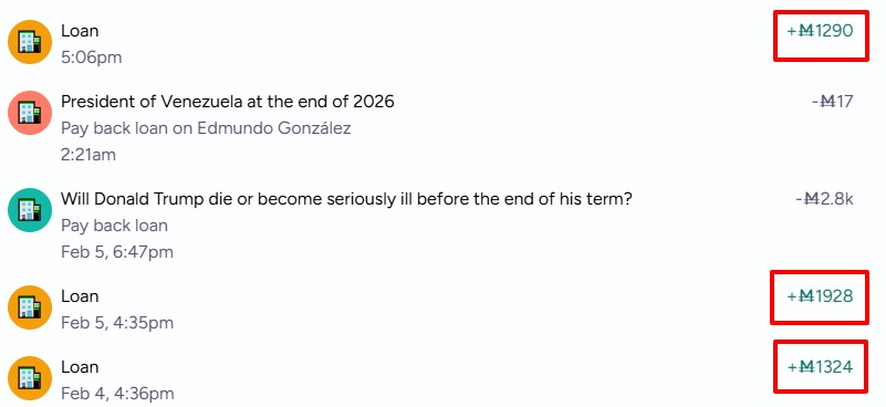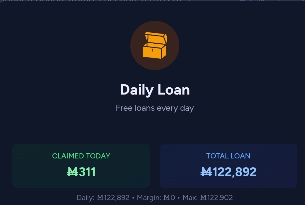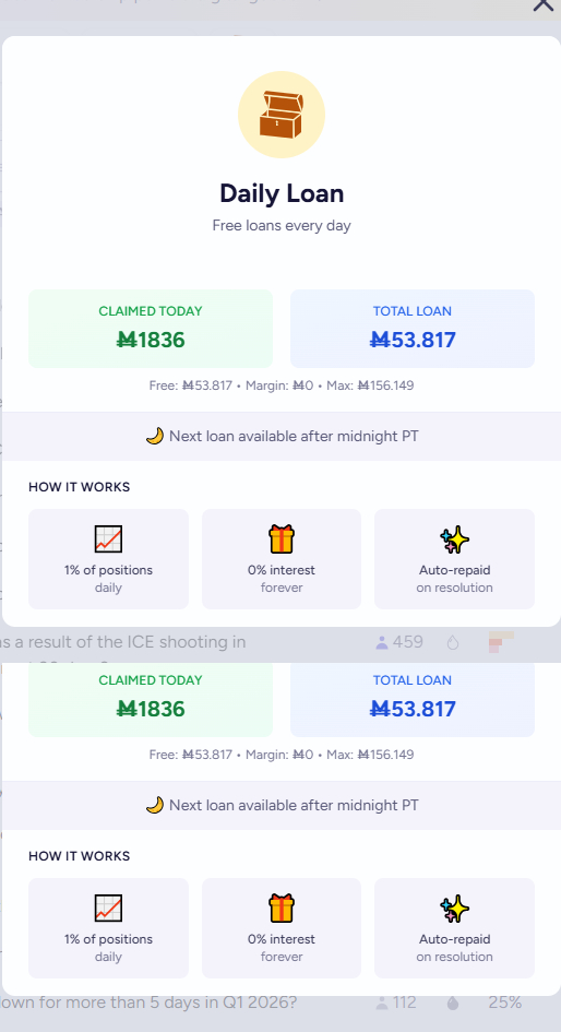 For example, I have 100M in cash. I bet 1000M on a market, and the interface tells me that 100M will be cash and 900M will be obtained through a loan at 0.03% daily interest. After the bet, I will have a balance of -900M. The negative balance becomes the amount of the loan I requested. I complete the daily mission, earn 25M, automatically repay 25M of the loan, and the balance becomes -875M. A market closes, I collect 1000M in cash, automatically repay the loan, and the balance becomes 125M.