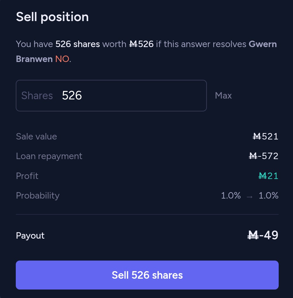 @Robincvgr No, look more closely. I didn't buy high and try to sell low. I'm holding No shares! I have 526 shares, those are worth 521 Mana right now. Their value is as close to their max possible value as it gets. I have a profit of 25 Mana.