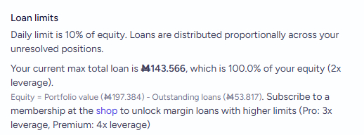 Your current max total loan is Ṁ120,599, which is 100.0% of your equity (2x leverage).