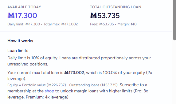Your current max total loan is Ṁ267,483, which is 100.0% of your equity (2x leverage).