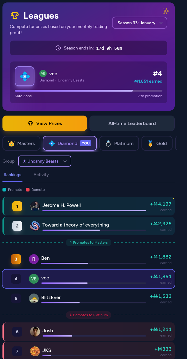 So effectively I ended up paying 50 mana/month for a star next to my name with the plus subscription... 50M because the 500M/month cost is getting offset by 15M/day extra in daily quest bonuses (50% extra of 25M trade and 5M share) * 30 days. I already have 12 streak freezes somehow that I do not expect to use up anytime soon, so the increase of the limit from 1 to 2 does nothing. The only other benefit is access to margin loans, which does not do anything for me, since margin loans are still inaccessible when free loans are at the net worth cap - it would require some very special one-off circumstance for there to be a day when my net worth jumps up by over 1%, or a big market closes and a bunch of loans are paid off, so that I cannot max out my loans with the free loan that day - probably only on New Year and election days (I mostly trade only US politics)...
