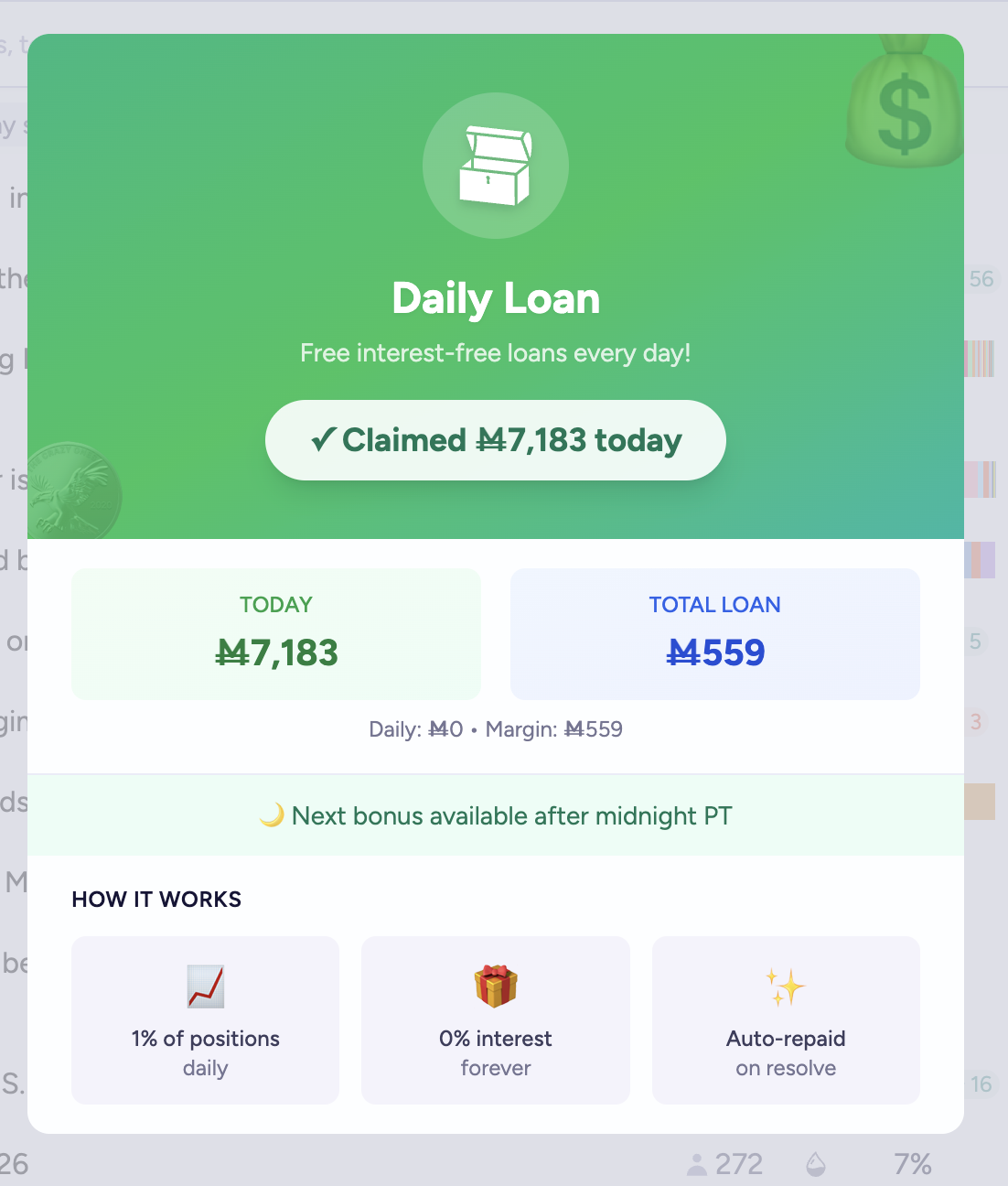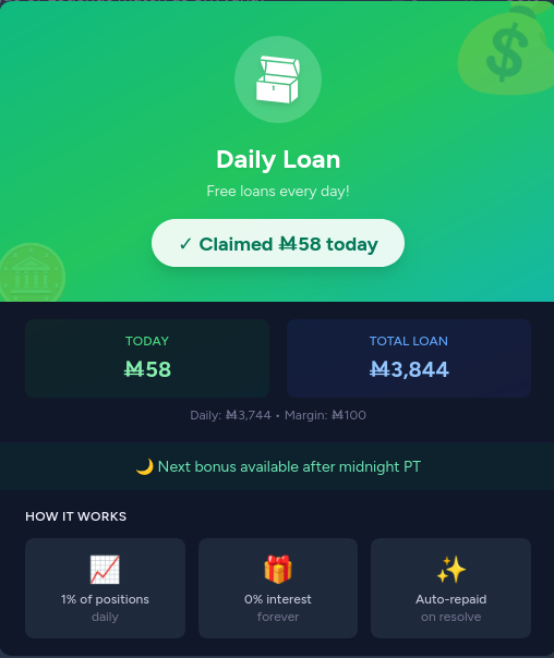 @Velaris I requested the loan every day, logging in and checking my notifications, even though I had liquidity equal to about 100 times what I was getting from the loan. It was an incentive to come back, in addition to the daily streak.